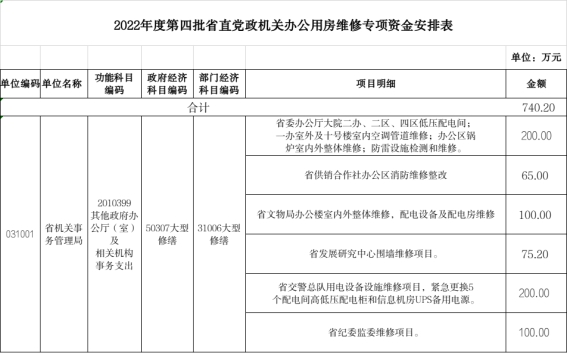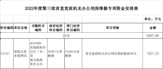 根据《湖南省省直党政机关办公用房维修专项资金管理办法》有关规定及2022年度省直党政机关办公用房维修规划,按照省财政厅有关通知精神(湘财资指〔2022〕9号、10号),现对2022年第三批和第四批省直党政机关办公用房维修专项资金分配情况进行公示,具体如下。